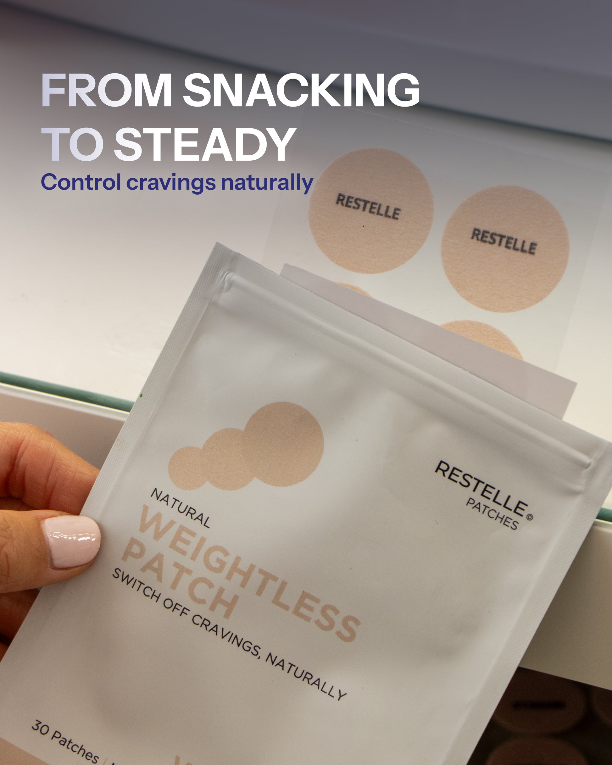 RESTELLE Weightless Patches are formulated to support appetite balance, energy stability, and metabolic harmony using clinically backed plant-based nutrients like Berberine, Fucoxanthin, and Green Tea Extract.